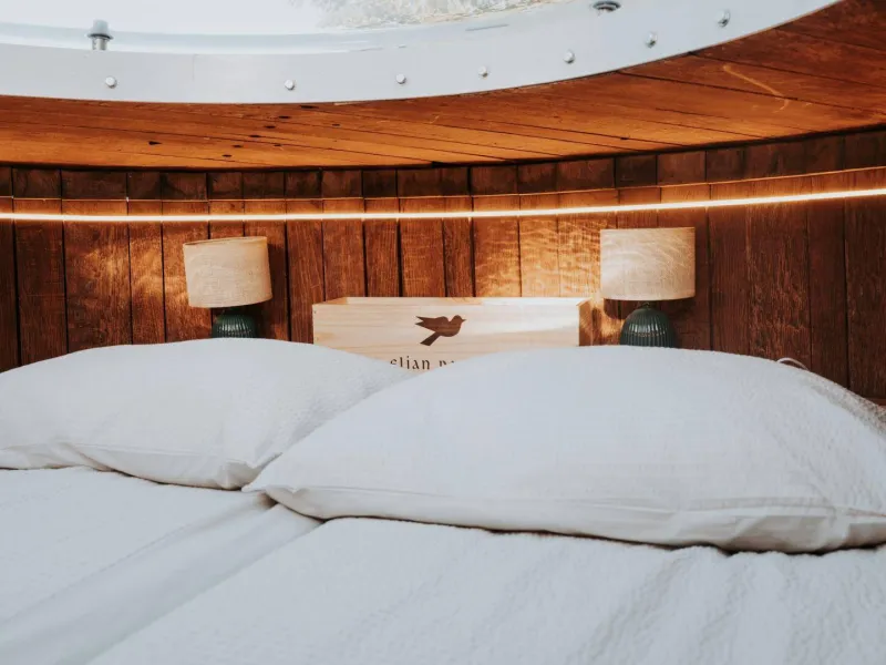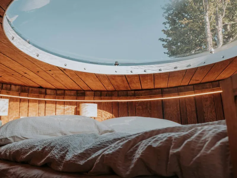 On the mezzanine, a 140x190 bed under a transparent dome lets you admire the stars before falling asleep.