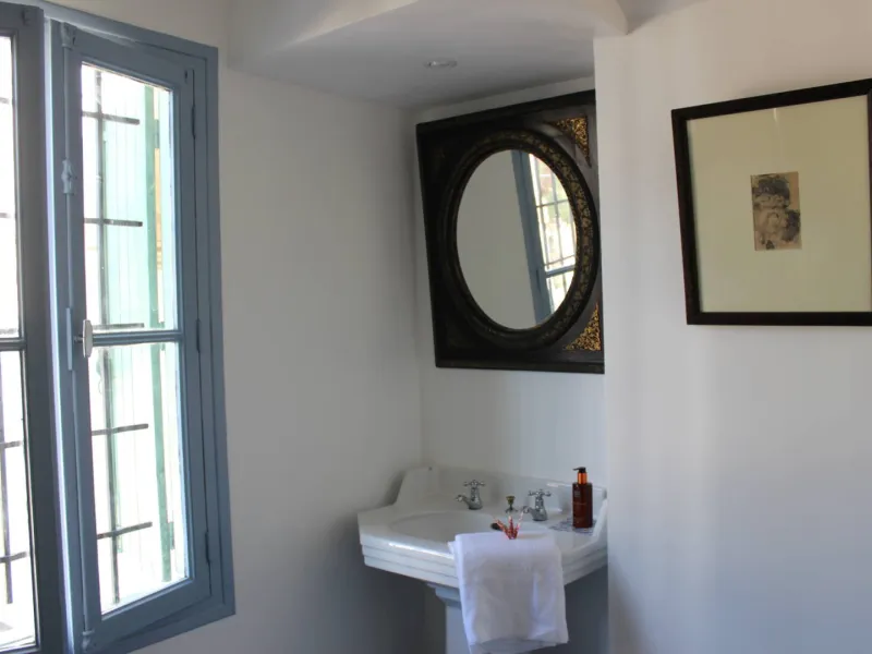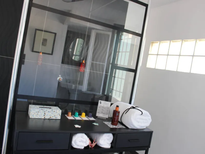 A 31m² bedroom with its small semi-private garden and bathroom with Italian showerprivate toilet, a haven of peace with a sober and intimate decor.