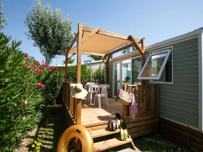 Campsite located on the banks of the Hérault River (free landing stage), in a peaceful setting. Swimming pool and Aquapark heated in spring and autumn, paddling pool, jacuzzi, 2 play areas, table tennis, multi-sports pitch, gym. Entertainment 2 times a week in high season. Beach and fishing port 2 km away. Food service, bar. Washbasins in cabins with hot water, washing machines, hot water for dishes, camping-car dumping area reserved for our customers.165 electrified, hedged pitches, including 50 "Grand Confort". WiFi Internet access at a charge on all pitches and in all mobile homes.