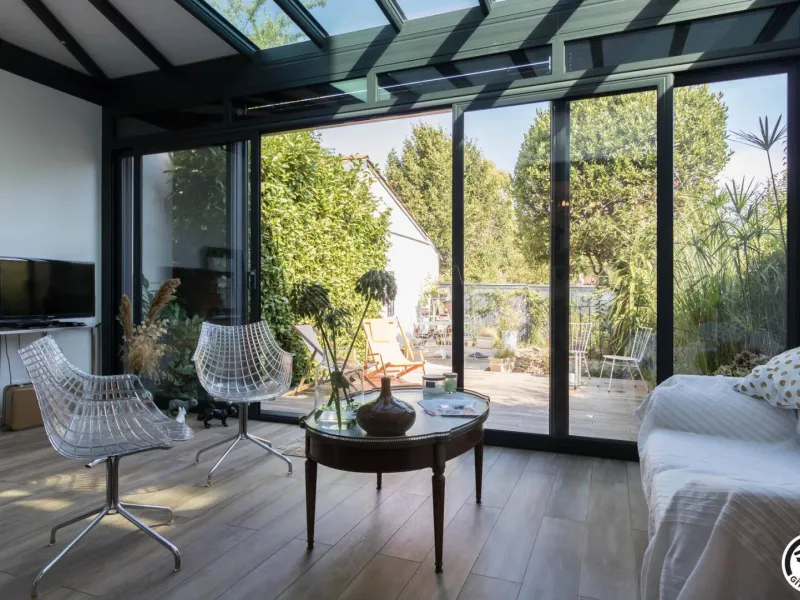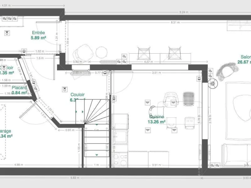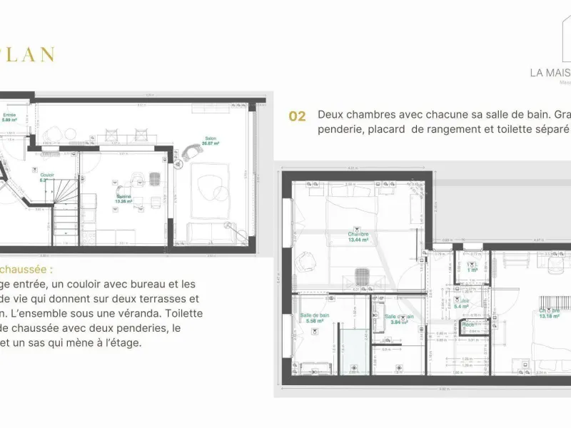 - Ground floor: entrance, light and airy living room with open-plan kitchen, opening onto the garden and terraces. Separate WC. Access to garage (washing machine and container).