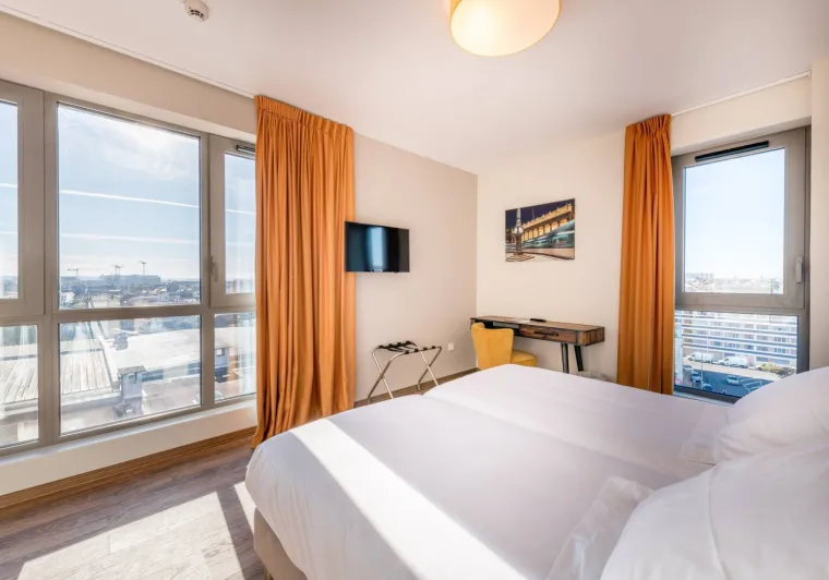 Eklo Bordeaux Centre Bastide is a hotel in Bordeaux center, located in the heart of the Bastide Niel eco-district, in a modern environment. Ideal for a stay in Bordeaux, it boasts a strategic location close to streetcar lines A and E (Jardin Botanique station), providing quick access to Bordeaux city center, and is about 10 minutes from rue Sainte-Catherine and Saint-André Cathedral. This budget hotel in Bordeaux center offers 199 rooms to suit all travelers. From private rooms (solo, duo, double, family) to studios and apartments for short or long stays, you'll find the ideal room, whether you're looking for a budget hotel or a family hotel in Bordeaux. Eklo Bordeaux features a French Kiss restaurant, offering seasonal gourmet French cuisine and a cocktail menu, all in a guinguette atmosphere.